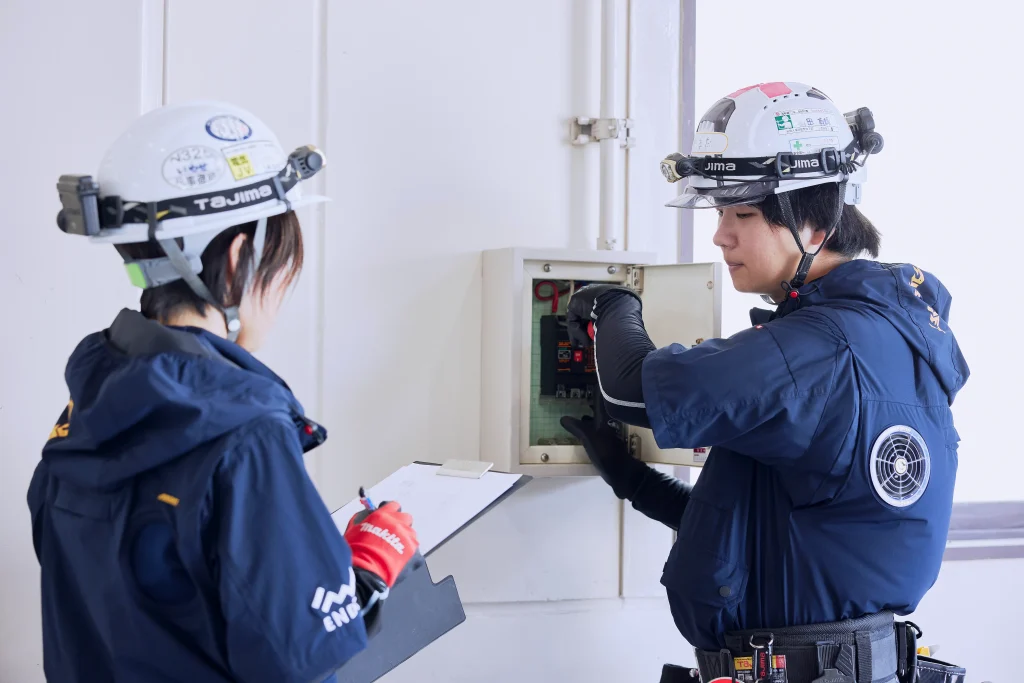 「盤のネジの締め付けや送電後のチェックが中心です。時間に余裕があるときは盤の清掃や補助作業、コンセントに貼るテプラ作成など、細かいことも任せてもらえます。元請けの方をサポートしながら、一つひとつ着実に覚えていくのが楽しいですね。」